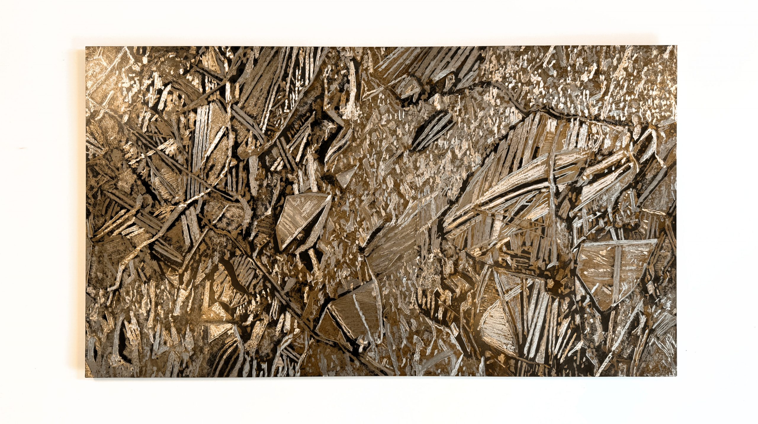 The relief was created on a black steel plate (107 × 60 cm) through freehand carving and acid patination. Projected video art sequences interact with the engraved plate, merging metallic texture with filmic movement to create new light-reflecting effects that shift dynamically with the viewer’s perspective.